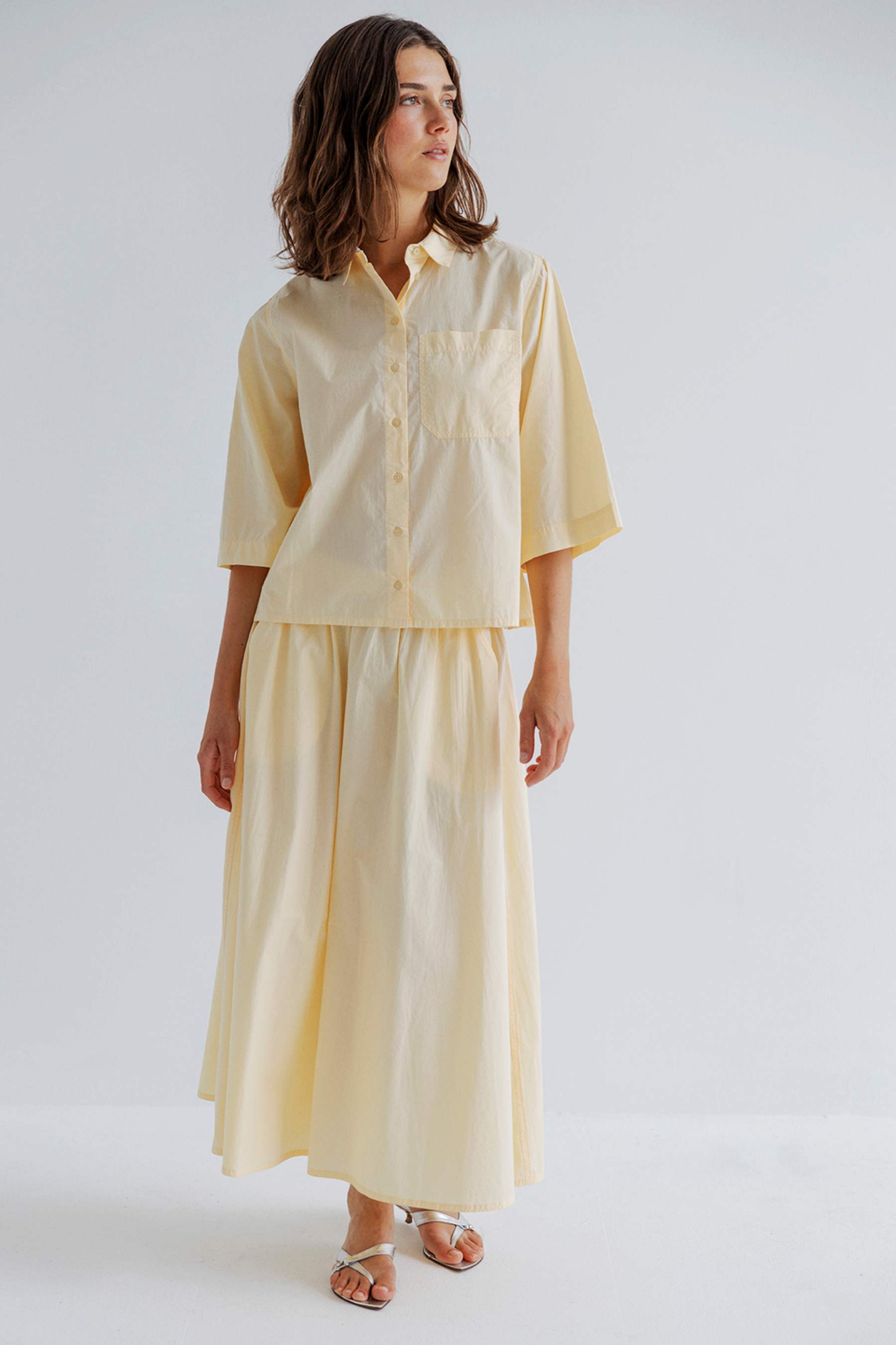 Skjorten er designet med klassisk krave, gennemgående knaplukning, trekvartærmer og en brystlomme. På ryggen har den en blød læg, som skaber let volumen og et smukt fald.