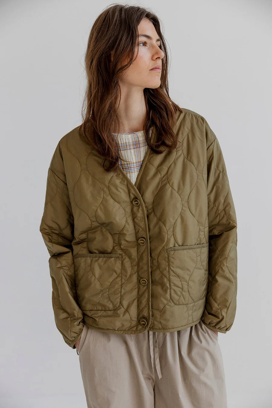 Nola er en let quiltet jakke i AJ117´s populære nylonkvalitet. Jakken er designet med V-udskæring, knaplukning og to påsatte forlommer. Den har en let cropped silhuet og justerbare snører i kanten, som gør det muligt at tilpasse pasformen og formen efter ønske. Det bløde quiltede mønster tilfører struktur, samtidig med at udtrykket forbliver enkelt og anvendeligt til hverdagsbrug.