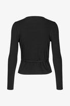 Langærmet slå om-top. Blød og elastisk økologisk bomuld i fin ribstrik. V-udskæring. Stofbånd i taljen. Slank pasform. Længden midt bagpå er 61 cm i størrelse small.
