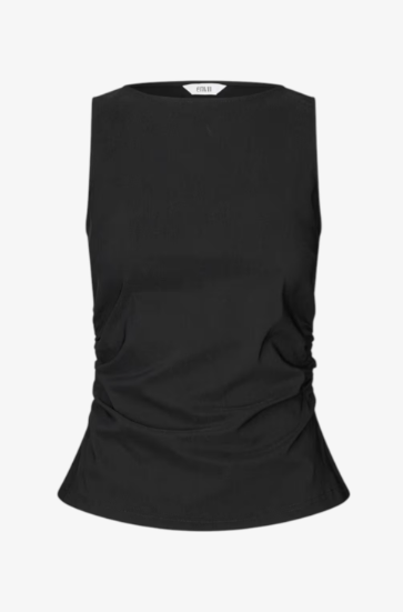 Ærmeløs top med rynkeeffekt i siderne. Glat, let materiale med en smule skinnende finish. Rund hals og elastiske læg i siderne, der skaber rynkeeffekt. Indsnit ved barmen. Slank pasform.