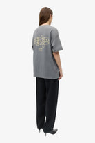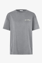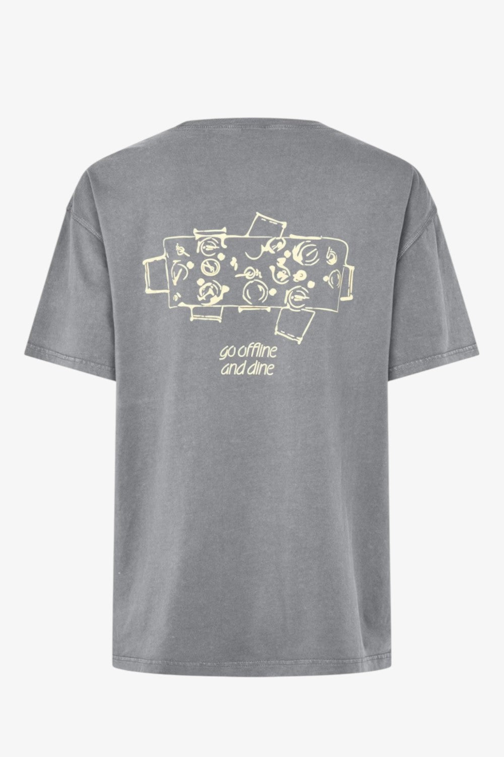 Kortærmet T-shirt i blød og glat økologisk bomuld med print på venstre side af brystet samt på ryggen. Designet med rund hals og korte ærmer med dropped shoulders-effekt. Afsluttet med ribkant ved halsen, flatlocksyninger ved hals og skuldersømme samt tvillingesøm ved ærmeender og nederkant. Løs pasform.