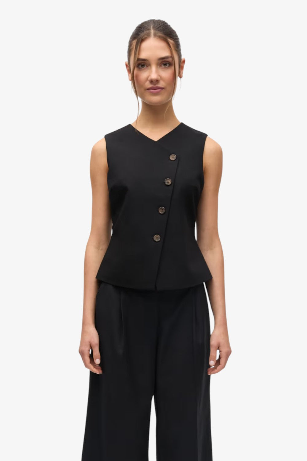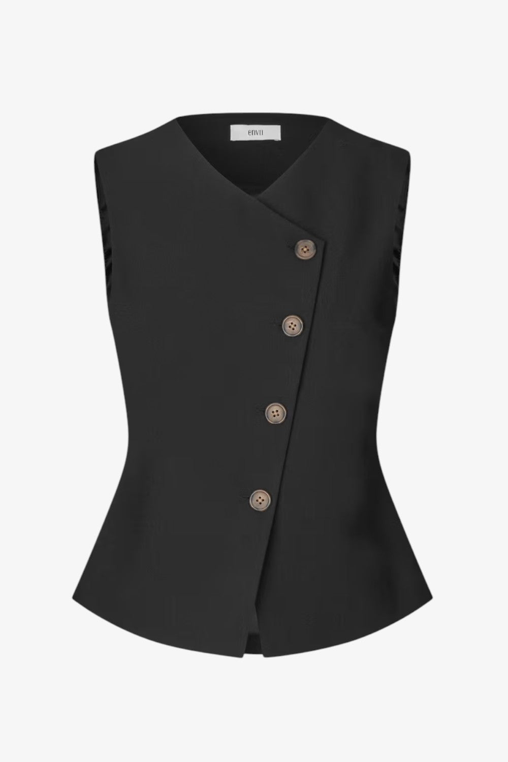 Skræddersyet vest med asymmetrisk front. Designet med V-hals og knaplukning foran samt formet kant forneden. Den slanke pasform giver et stilrent og sofistikeret udtryk.