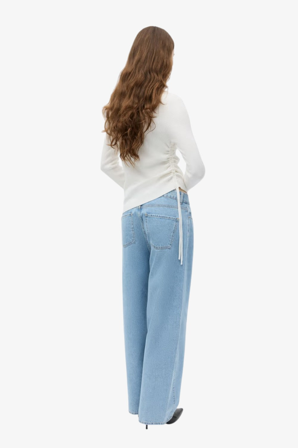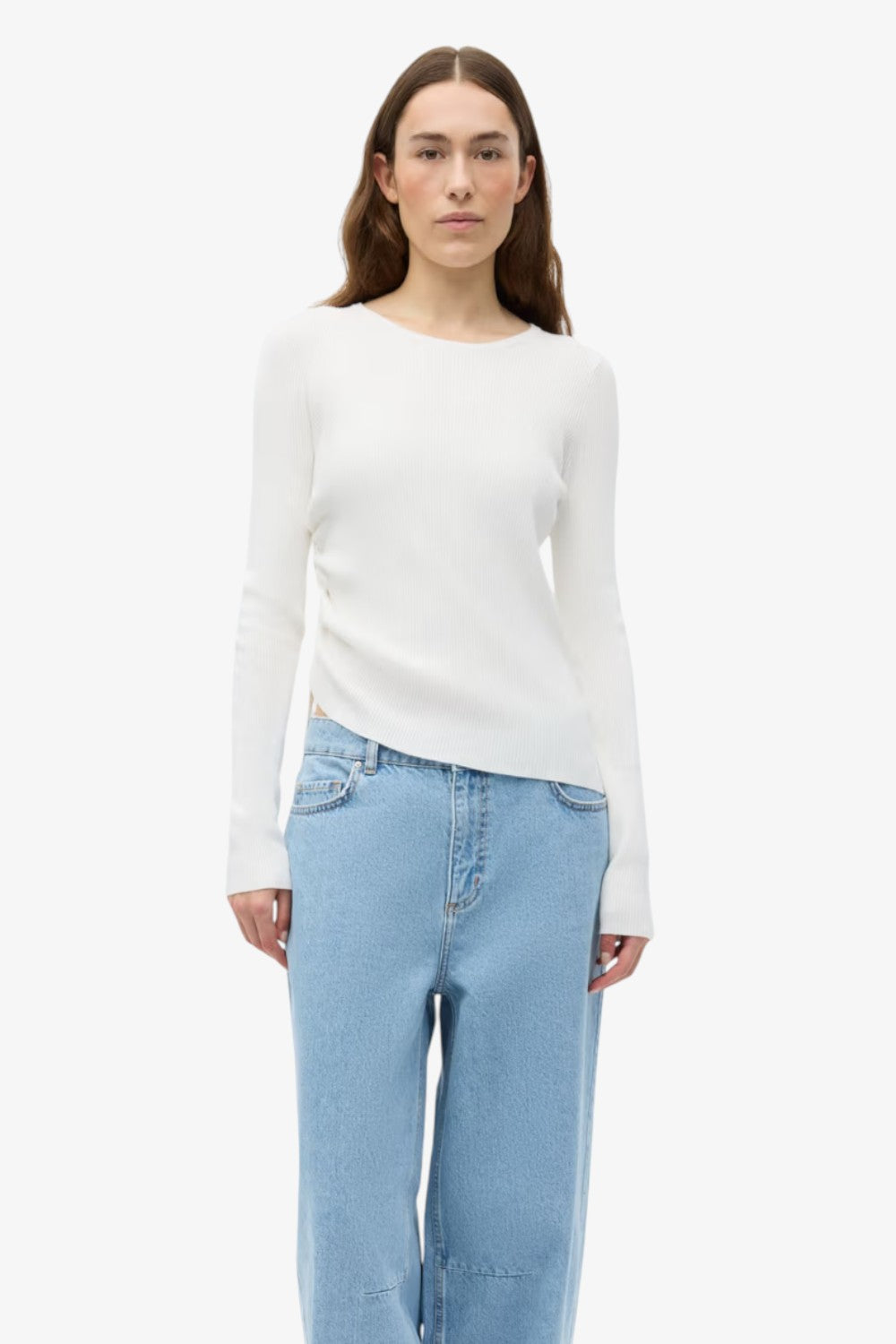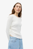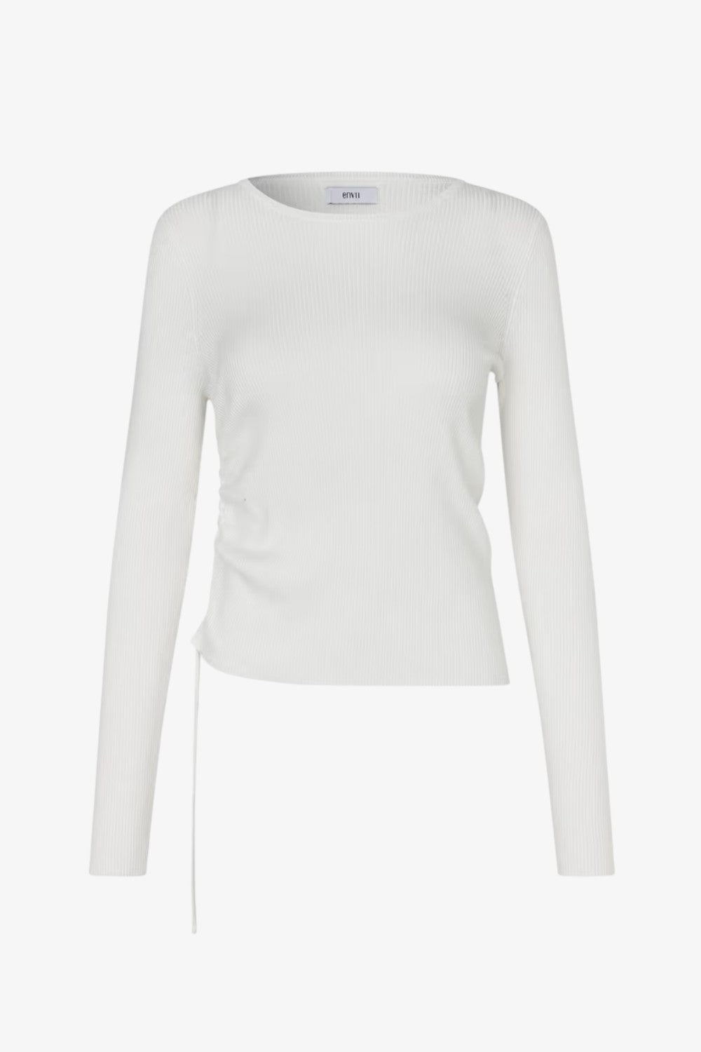Langærmet ribstrikket sweater med tætsiddende pasform. Designet med rund hals samt enkle afslutninger ved manchetter og nederkant. Justerbar rynkedetalje i siden med snøre, der giver mulighed for at variere looket.