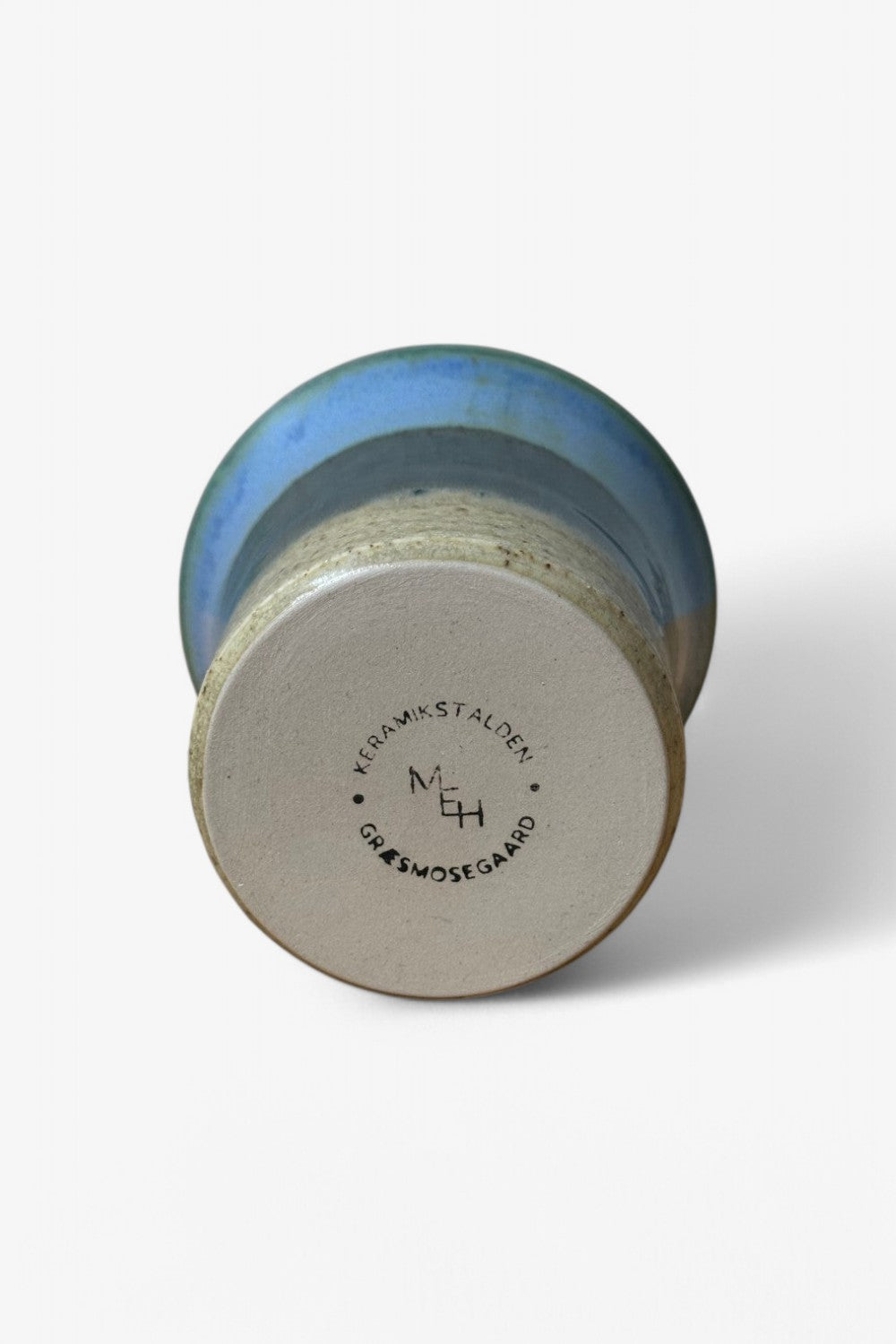 Smukt håndlavet krus fra Keramikstalden i Græsted. Kruset er lavet i lys ler, med en lækker sandfarvet bund og har to forskellige glasurer, i forskellige grønne/blå nuancer.