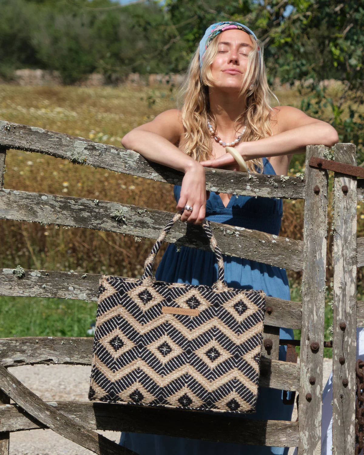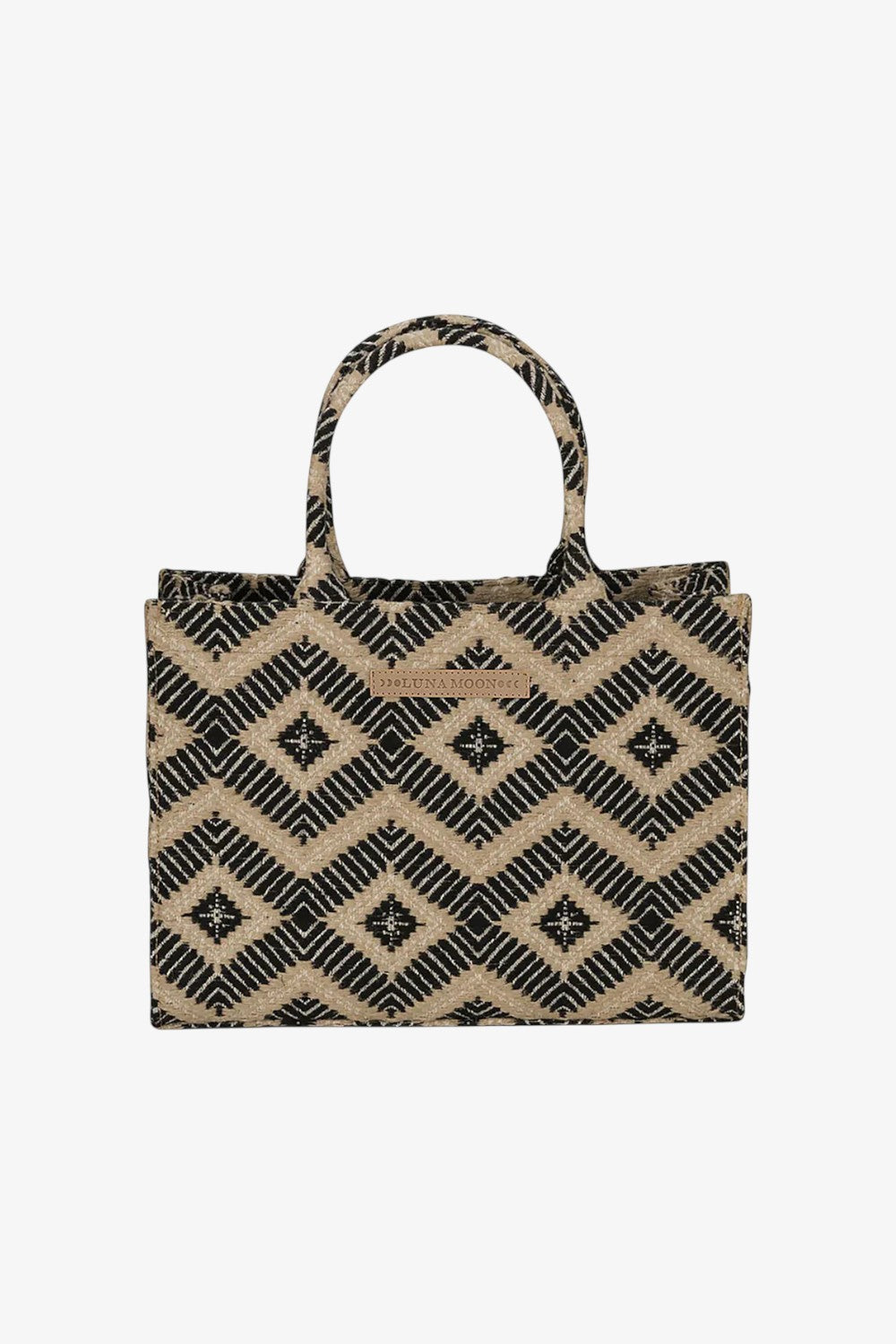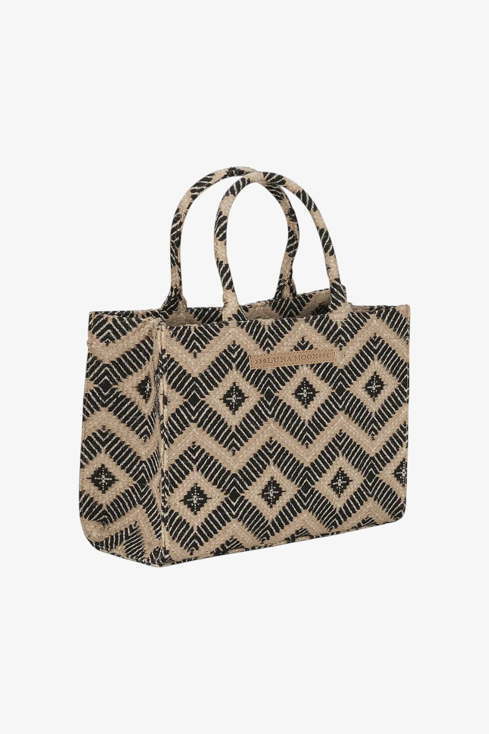 Tasken er lavet af 50% jute, 40% bomuld og 10% viskose.