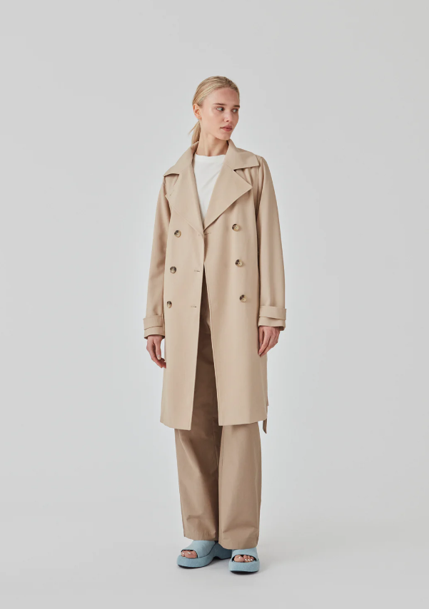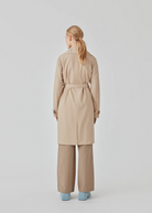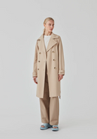 Trenchcoat jakke i beige med i et klassisk udtryk bred krave, bælte i livet og knaplukning. Hiro jacket er perfekt som overgangsjakke fra vinter til forår. Jakken har en rummelig pasform. Vi anbefaler at gå en størrelse ned. Modellen er 174 cm og har en størrelse S/36 på.