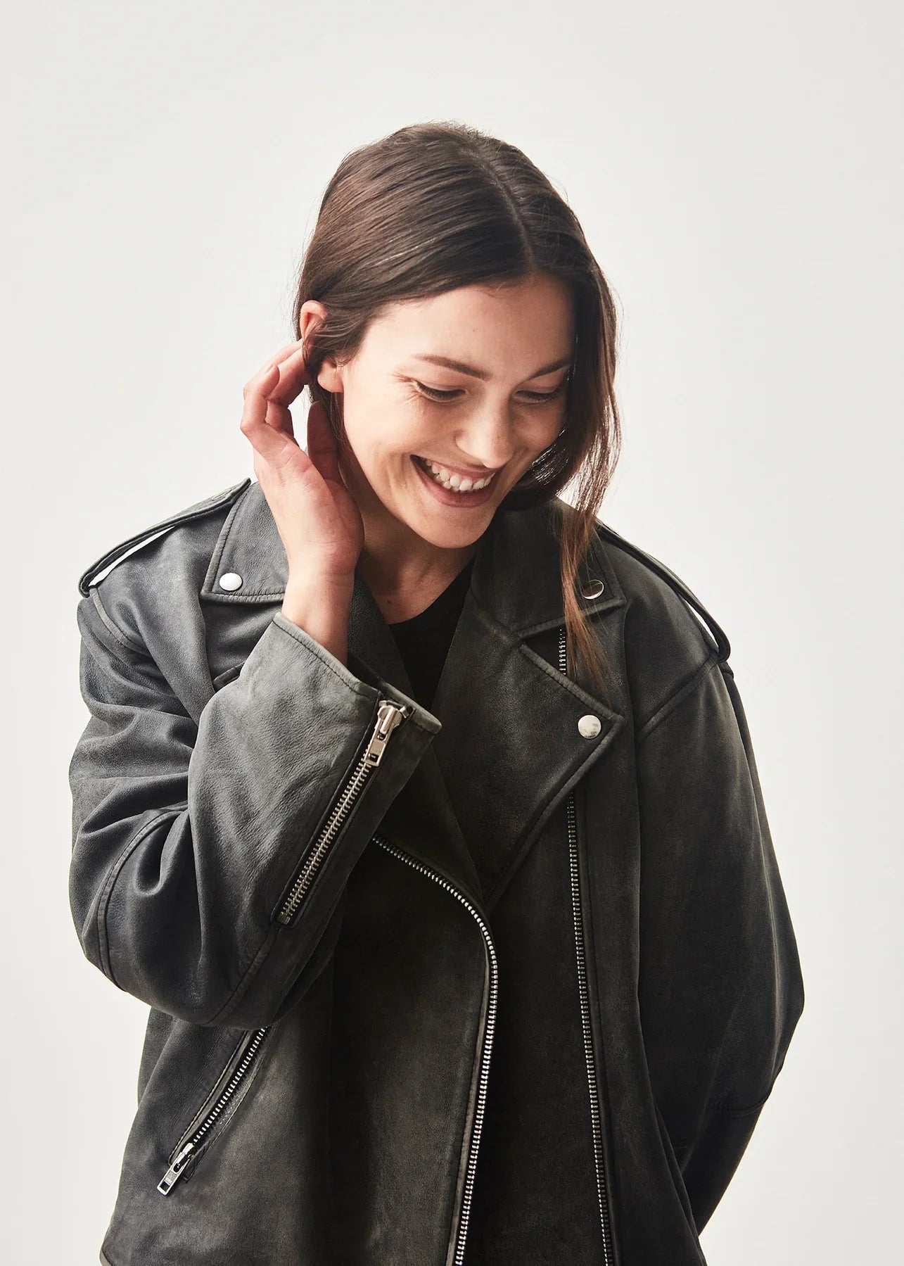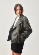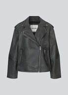 HullaMD-jakken er en tidløs investering i luksuriøst design og materialer. Fremstillet af blødt lammeskind kombinerer den klassisk bikerstil med moderne detaljer. Den skæve lynlås, lapeller med trykknapper og lynlåslommer skaber et råt og sofistikeret look, der passer til enhver lejlighed.