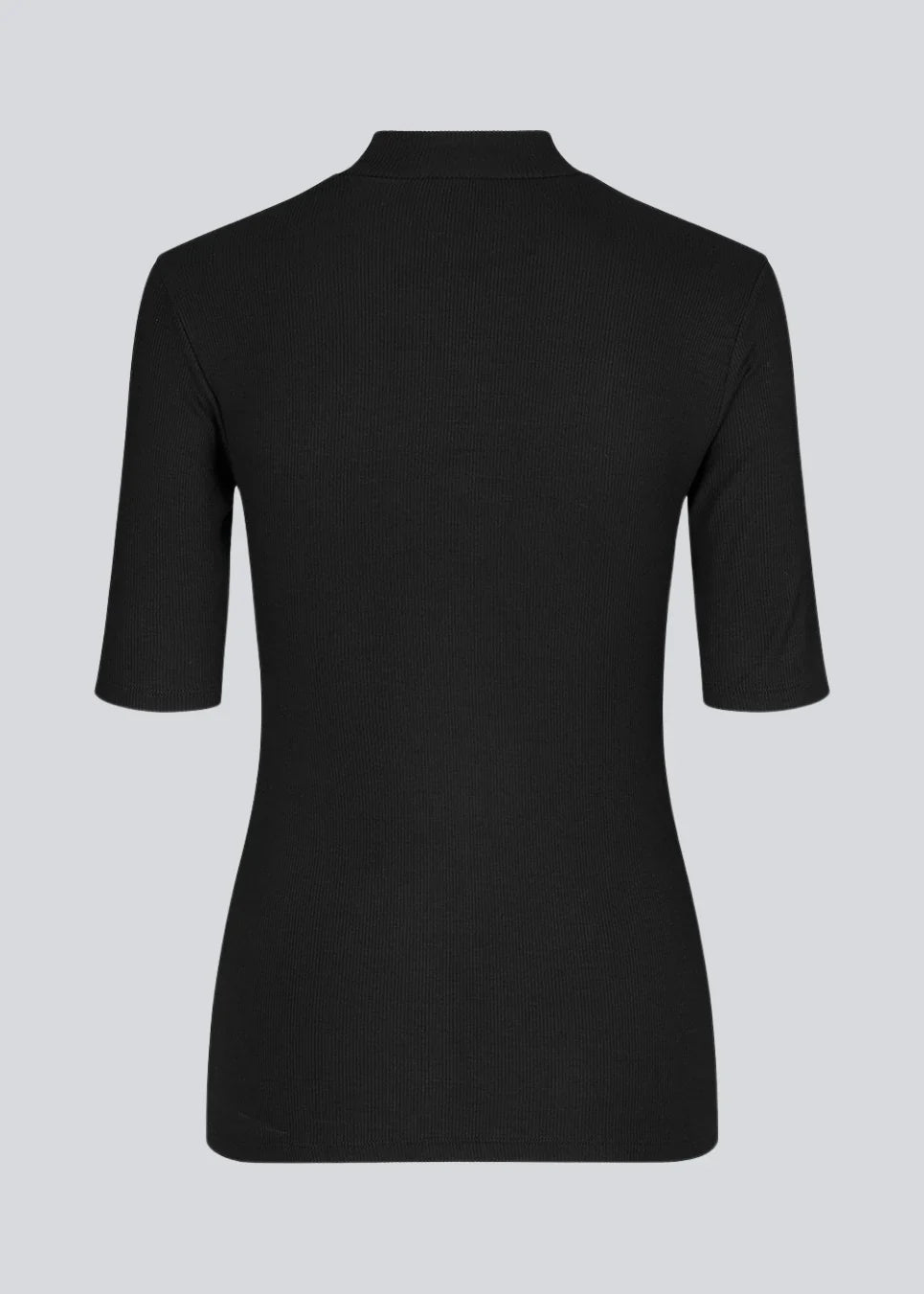- Design: Kortærmet T-shirt med høj hals og tætsiddende pasform, der fremhæver silhuetten.