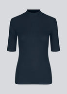 - Design: Kortærmet T-shirt med høj hals og tætsiddende pasform, der fremhæver silhuetten.