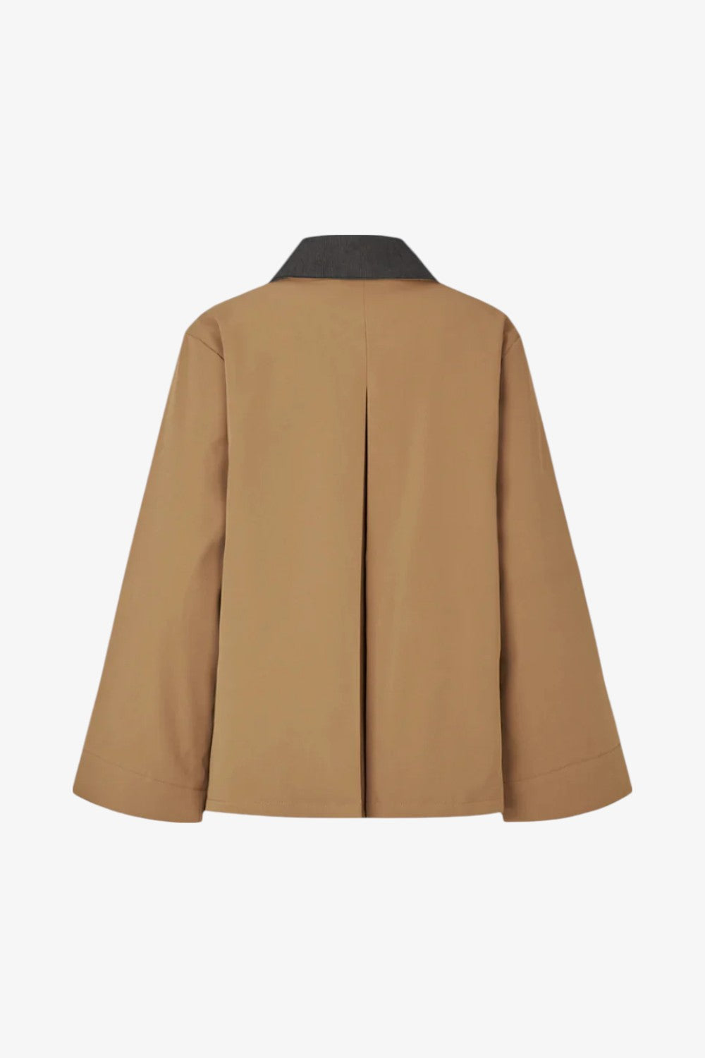 Løs jakke i beige med kontrast fløjlskrave i mørkebrun og skjult knappelukning. Orkidemd jacket har læg på rykken.