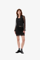 Sort figursyet skjorte i gennemsigtig materiale. Roccomd shirt har en klassisk krave og knaplukning med et smuk syet rosenmønster – feminin og stilfuld.