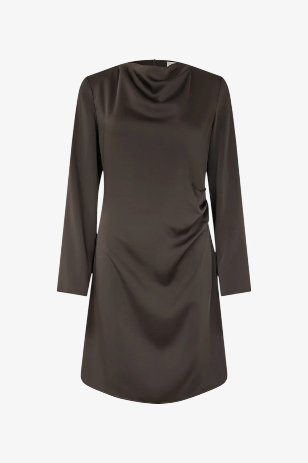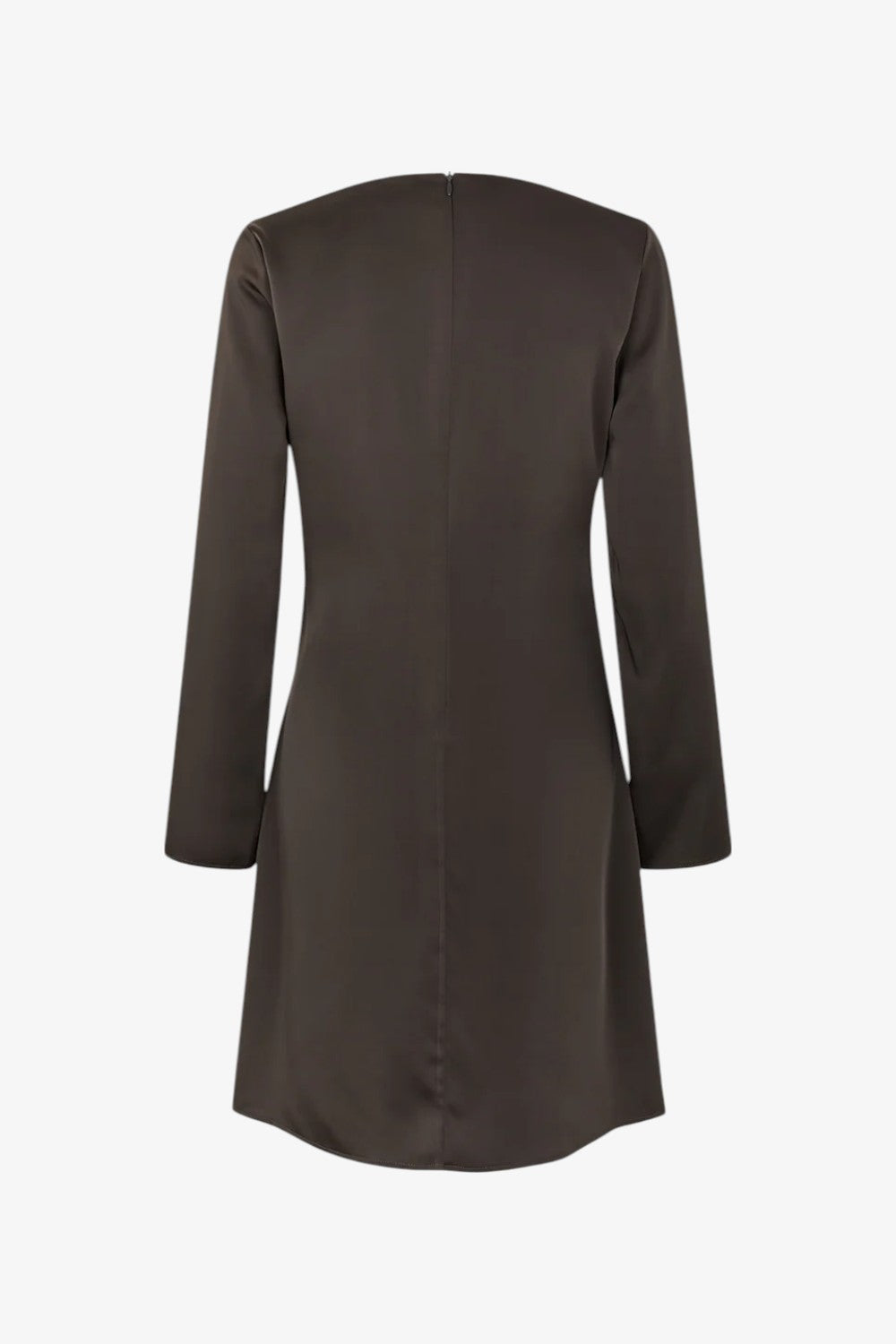 Den populære og altid udsolgte Tailormd dress, er nu kommet i en kortere version med lange ærmer. Stadig i en smuk satin med flatterende rynkedetalje i siden og halsudskæring med let vandfald. TailorMD LS short dress i brun har lange ærmer og usynlig lynlås i ryggen.