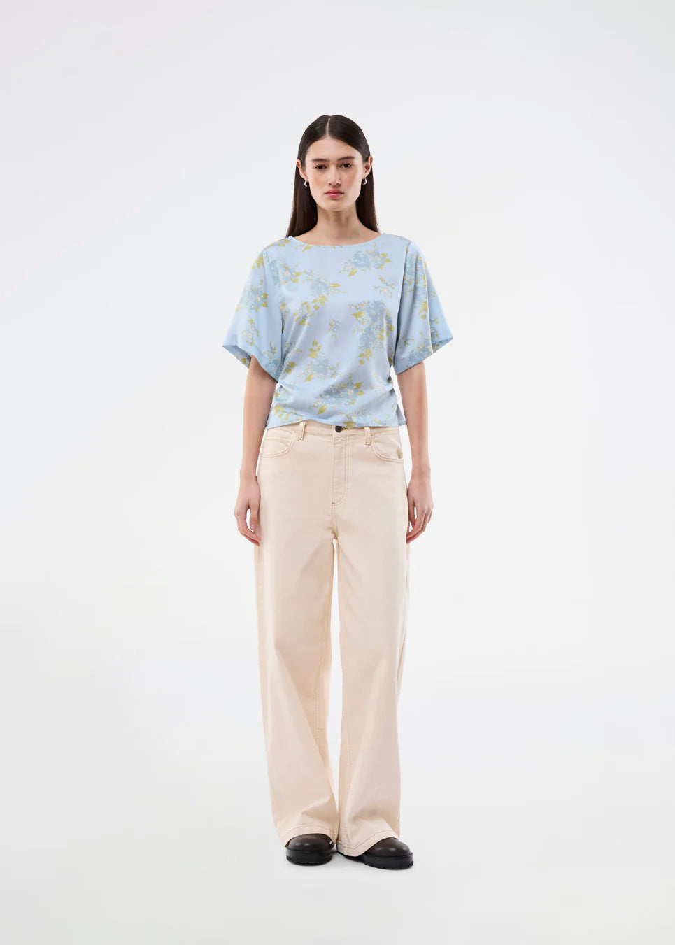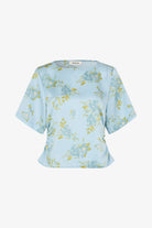 Let og feminin bluse med romantisk lyseblåt blomsterprint. Uttamd SS top er designet med korte, vide ærmer og en løs pasform for et elegant og ubesværet udtryk. Fremstillet i 100% genanvendt polyester. Modellen er 175 cm og har en str. S/36 på.
