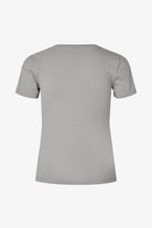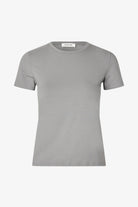 Tætsiddende basic t-shirt i grå med høj og lige udskæring i halsen. DaeMD t-shirt er fremstillet i økologisk bomuld. Modellen er 175 cm og har en størrelse S/36 på.