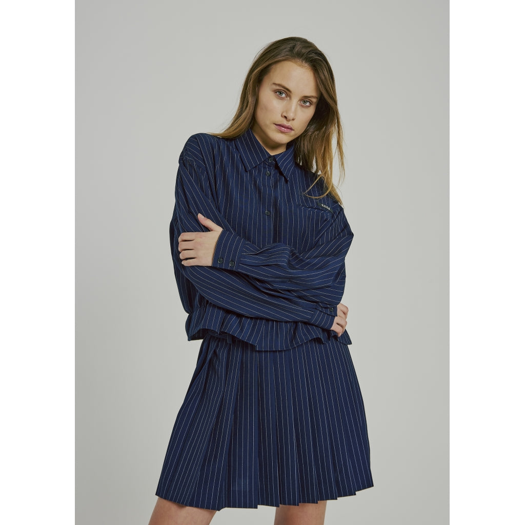 Neo skjorten forener tidløs skrædderstil med en moderne, oversized pasform. Designet i navy med fine nålestriber, og detaljeret med klassisk krave, knaplukning foran og afslappede ærmer – for et ubesværet, men elegant look. Style den med den matchende nederdel for et koordinert sæt eller brug den med jeans til et alsidigt hverdagsoutfit.
