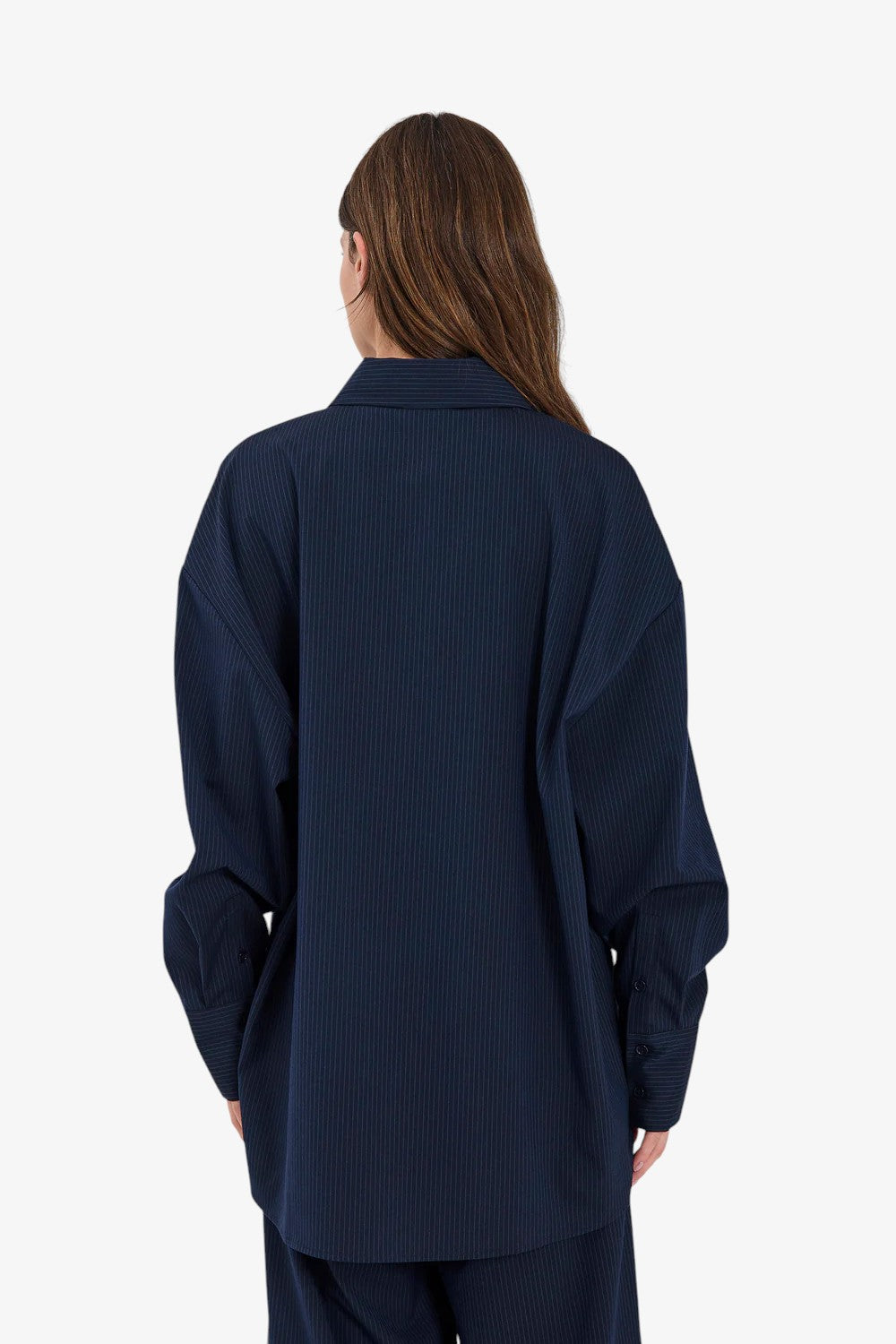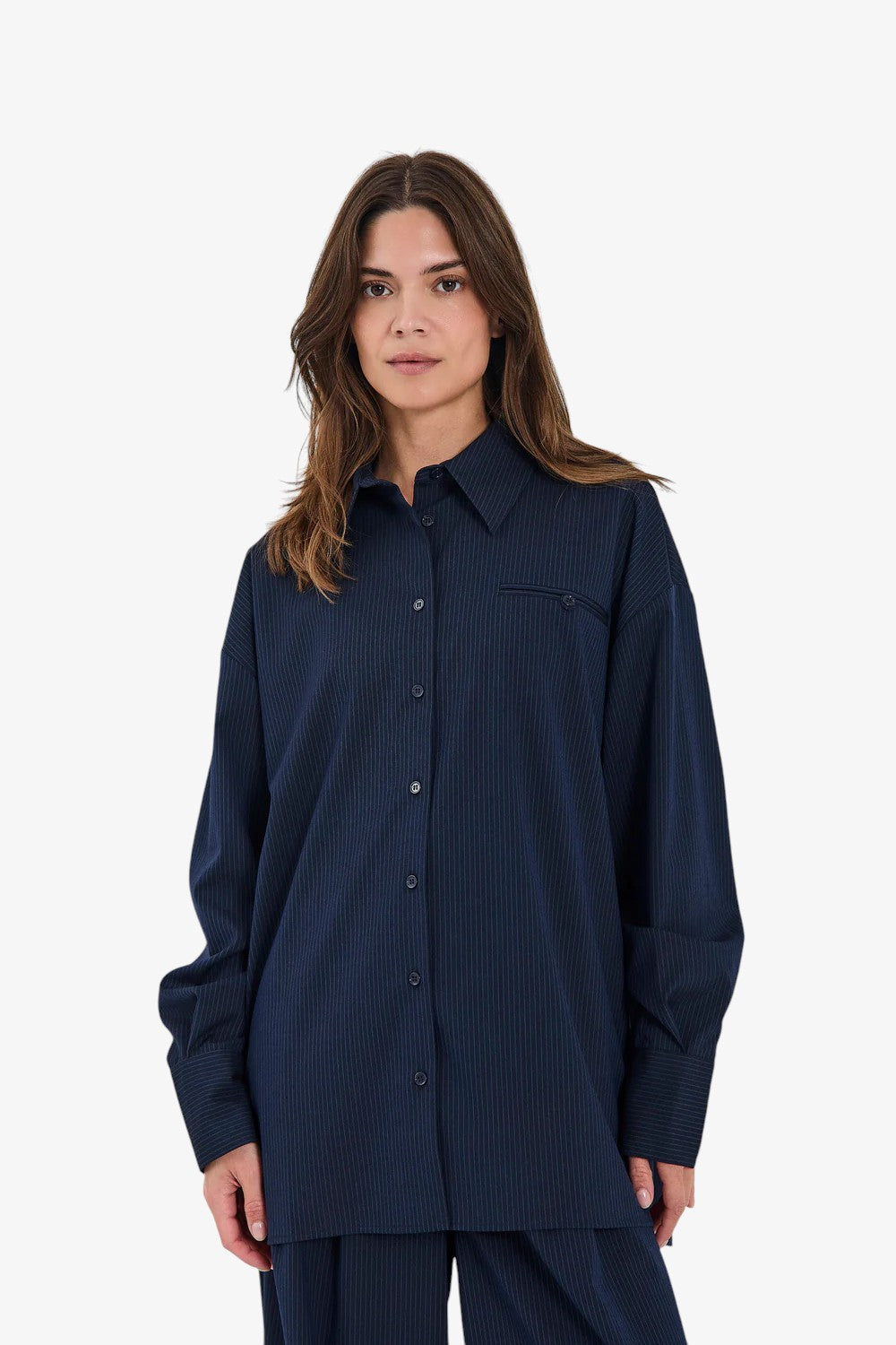 Oversized nålestribet skjorte med afslappet pasform og sænkede skuldre. Designet med knaplukning foran og en enkelt brystlomme for et minimalistisk, skræddersyet look.