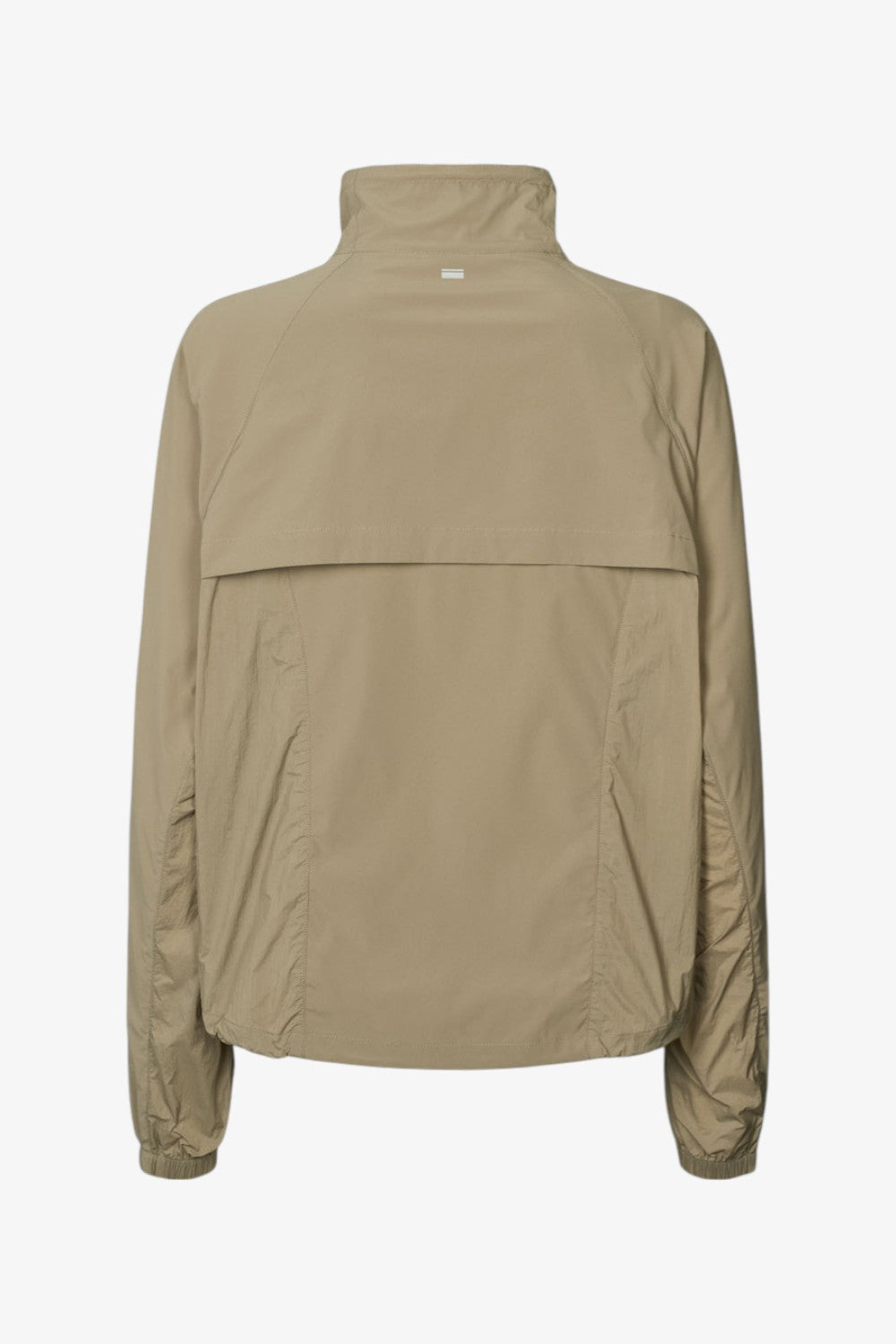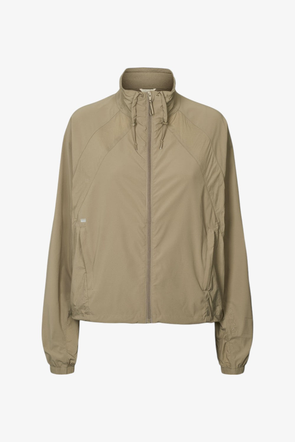 Den langærmede sportsjakke er i genanvendt polyester med genanvendt YKK-lynlåse foran og ved lommerne. Jakken har en løs og en smule oversize pasform med brede ærmer, elastik omkring håndleddene samt en justerbar elastik ved den nederste søm, som gør det muligt at tilpasse pasformen efter din stil. Den har også en justerbar snor i kraven for at holde vinden på afstand. Den har praktiske mesh-detaljer ved ryggen og under armene for bedre åndbarhed, og fungerer godt som en vindjakke. Den afslappede pasform gør den behagelig at bevæge sig i og passer perfekt til de mange udendørs- og hverdagsaktiviteter.