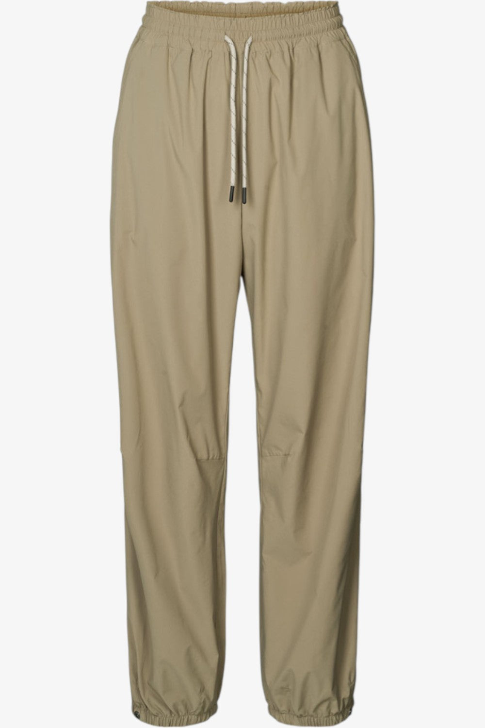 Trykknapper ved buksebenet og elastikker ved anklerne for justerbar bredde og pasform.