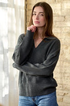 Polo strik til kvinder i 50% uld og 50% akryl. Poloen har ribstrik og V-hals.