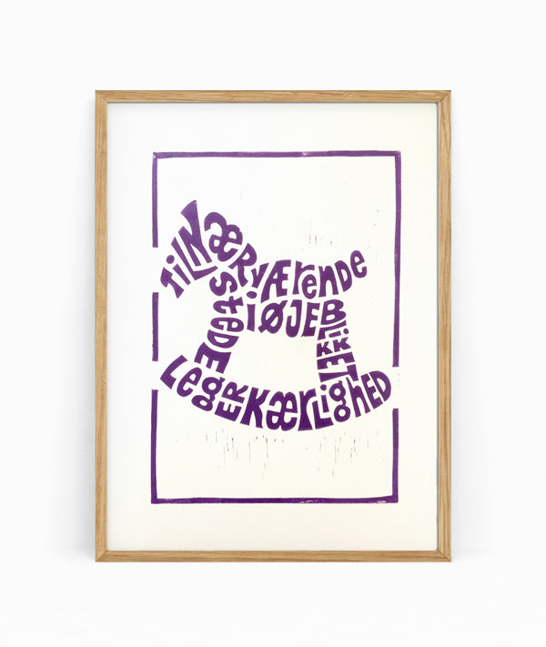 De typiske kendetegn ved mine tryk er det typografiske islet og udformning af hovedelementet i illustrationen. Når jeg arbejder med et billede, starter min proces altid med skitsering af ord, der langsomt bygges op og til sidst danner en “historie” samt visualisering af en genkendelig grafisk form fra hverdagen. Jeg ved aldrig helt, hvordan det endelige resultat bliver, og det gør processen interessant og uforudsigeligt."