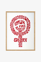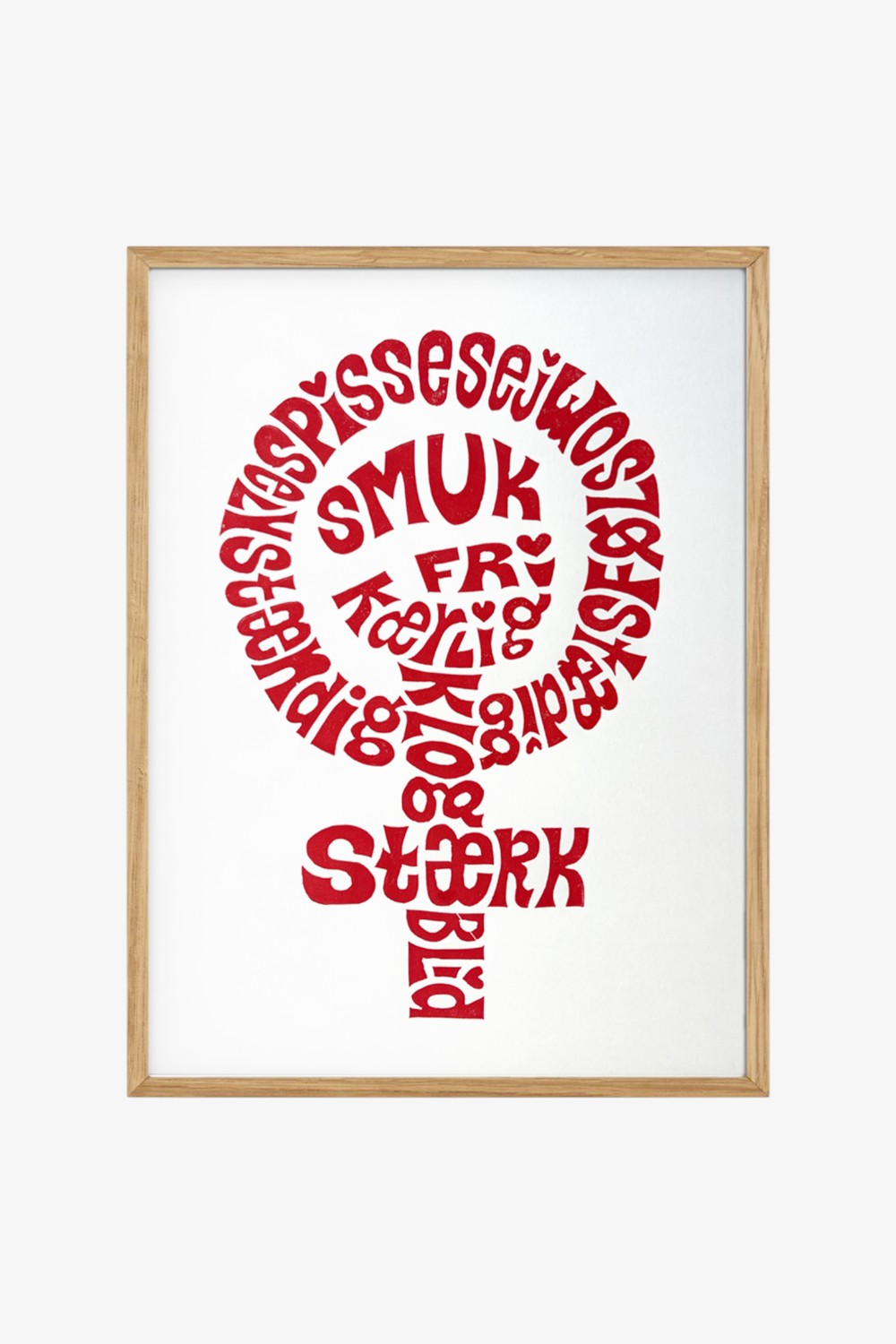 De typiske kendetegn ved mine tryk er det typografiske islet og udformning af hovedelementet i illustrationen. Når jeg arbejder med et billede, starter min proces altid med skitsering af ord, der langsomt bygges op og til sidst danner en “historie” samt visualisering af en genkendelig grafisk form fra hverdagen. Jeg ved aldrig helt, hvordan det endelige resultat bliver, og det gør processen interessant og uforudsigeligt."
