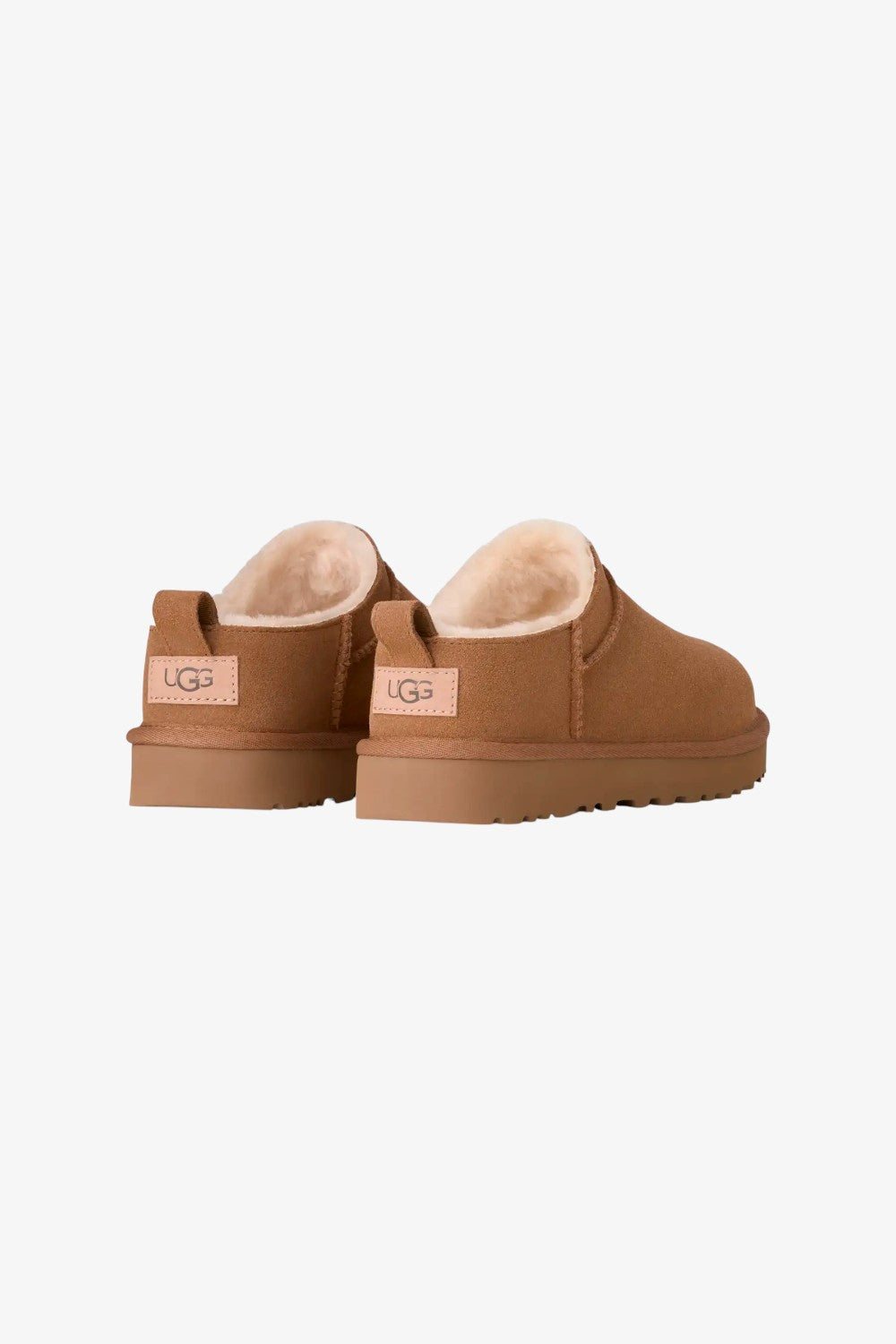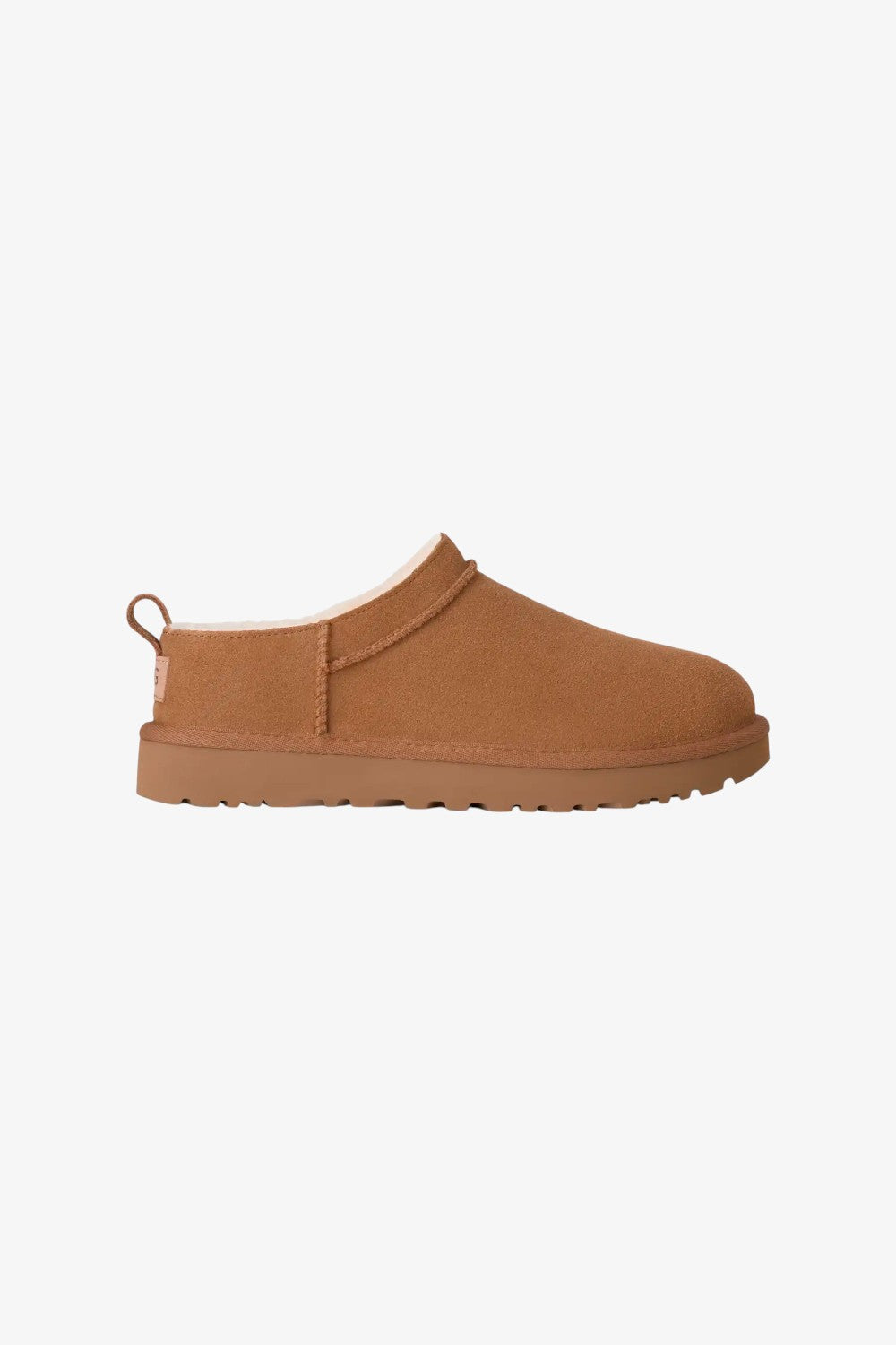 Classic Micro er en nyfortolkning af den ikoniske Classic Boot i et lavere, mere minimalistisk design – uden at gå på kompromis med komforten. Overdelen er fremstillet i ruskind og foret med blød, ægte lammeskind, som naturligt temperaturregulerer og gør støvlen behagelig at bruge med eller uden strømper. Den lette ydersål i sukkerrørsbaseret EVA giver god støtte og en blød, slipper-lignende fornemmelse til hverdagsbrug.